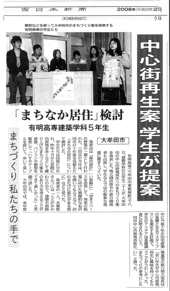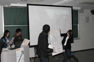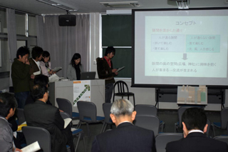 2月8日(金)13時から15時,本校総合研究棟2階講義室で,第3回大牟田中心市街地まちづくり提案発表会(5A都市設計)を行いました.今年度のテーマは「10年後のまちなか居住を考える」でした. 発表会には,授業にご協力をいただいた大牟田市役所と専門家の方や,商業関係者や住民の方,そしてマスコミの方など,25名の方々に参加していただき,学生たちの提案に対するご意見を頂戴しました. 皆さま,年度末のお忙しいときに発表会にご参加いただき誠にありがとうございました. |