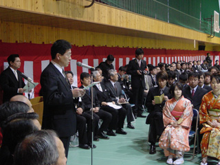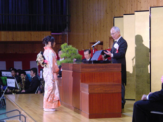 | 専攻科を代表して堤さんが学位記を受け取る | 答辞を建築の関君が読み上げる |