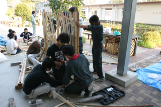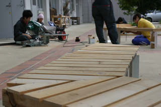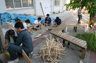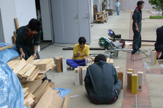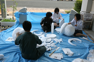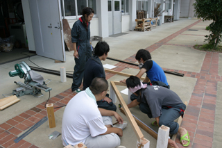 「Think Globally ・ Act Locally 〜今から始めよう,未来の為に〜」です. 建築学科では「ECO」をテーマに夏休み前から5年生が中心となって高専祭の準備に取り組んでいます. 皆さん,お時間があれば是非学生たちが作り上げる高専祭を見に来てください. 以下に学生たちからのメッセージを紹介します. ----------------------------------------------------------------------------- 今回私たちは”ECO”をテーマに空間づくりを行いました.建築棟前の広場にはおしゃれなフリーマーケット, おいしい屋台等楽しい空間が広がります.ほかにも,みんなで楽しめる,土壁製作,様々なアート空間の広がり, 建築の楽しさ,おもしろさを味わうことができます.このようなすべてのことを”ECO”をテーマに考えていますので, 楽しみながら環境を考えることができると思います. みなさん,この建築の空間で遊んでいきませんか? (o^ロ^) ----------------------------------------------------------------------------- 以下,学生たちの準備の様子を写真で紹介します. |