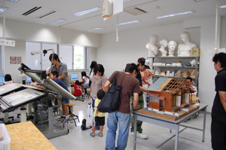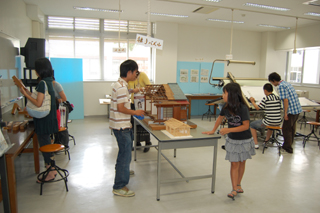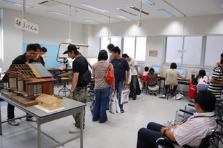 建築学科紹介のパネルや学生作品を展示しました. 体験教室にはたくさんの小学生,中学生,保護者の方々にご参加頂き, たくさんの折り紙建築を作り,お土産として持って帰って頂きました.また,「君も建築デザイナー」では, ドラフターを使ったドローイングやCAD,建物実測,液状化実験,継手パズル, 車椅子など様々な体験を通して建築を学んで頂いたと思います. ご参加された皆様ありがとうございました. 以下,「君も建築デザイナー」および「折り紙建築」の様子を写真で紹介します. |