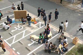 | 廃材を使ったベンチも大活躍 | 廃材ベンチはくつろぎの一時を作れました |
