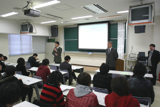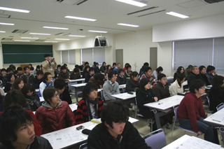 | 講演を聞く学生たち | 講演をされる三井先生 |