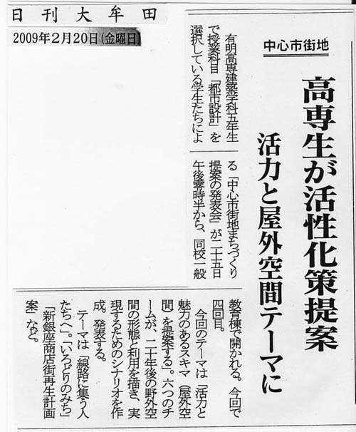 ご協力・ご支援を頂いている大牟田中心市街地関係者の皆さまには,深く感謝申し上げます. 発表会で学生たちが発表させていただく作品は,昨年10月より,現地調査と提案検討を重ねてきた成果です. 今回のテーマは,「活力と魅力のあるスキマ(屋外空間)を提案する」です. 各チーム,20年後のスキマ像(屋外空間の形態と利用)を描き,それを実現するためのシナリオを考えました. 発表会は一般公開で行います.年度末のお忙しいときとは存じますが, みなさまからの貴重なご意見を頂戴できれば幸いです.宜しくお願い申し上げます. 日時 :2009年2月25日(水) 5〜7限目(短縮授業) 12:30〜14:30 科目 :5A 都市設計(一般公開)「第4回大牟田中心市街地まちづくり提案 −活力と魅力のあるスキマ(屋外空間)を提案する−」 場所 :一般教育南棟 3階 多目的室 担当者:加藤浩司 ************************************** ・ 線路に集う人たちへ(6名) ・ いろどりのみち(6名) ・ 新銀座商店街再生計画案(6名) ・ リニューアル新銀座〜再開発プロジェクト〜(2名) ・ 緑 (6名) 緑緑 ・カコムミドリ(5名) ************************************** |
