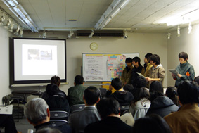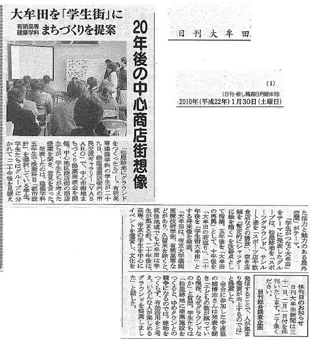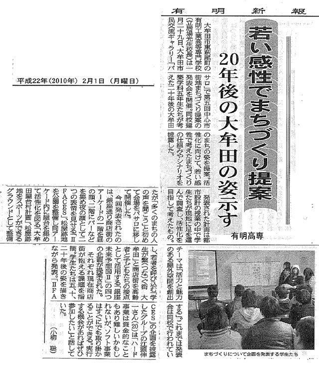 (大牟田市)で,まちづくり提案の発表会を行いました. 当日は,年度末のお忙しい中,地元住民の皆さま,商店街関係者の皆さま, 大牟田市役所,大牟田商工会議所,マスコミ関係者の皆さまにお越しいただき, 学生の発表に対し貴重なコメントをいただきました. 発表会にご参加いただきました皆さま方に,深く御礼を申し上げます. 以下,新聞記事を紹介します.また,これらの他,NHK「なっとく福岡(1月29日放送)」 の中でも紹介していただきました. 報道関係者の皆さま,ありがとうございました. |