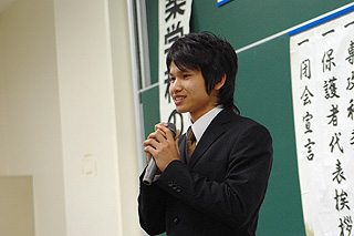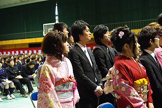 | 谷口君が学科代表として卒業証書を受け取る | 卒業証書授与で起立する学生 |