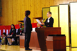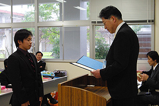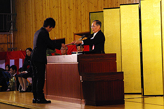 | 修了を受ける専攻科生 | 修了証を受ける専攻科の向坂君 |