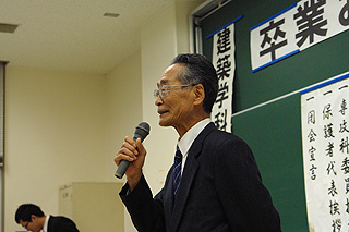 建築学科では,34名の5年生が卒業を,6名の専攻科生が修了の栄誉を得ました. 午後からは,それぞれの学科において学科の会が行われました. 学科の会では卒業生,保護者,教職員が参加し,学科長鳶先生と萩明会会長の祝辞を頂くととともに, 1年次の担任の濱田先生,3年次担任の上原先生,4,5年次担任の岩下先生,そして,専攻科担任の松岡先生から挨拶がありました. また,卒業・修了した学生全員から抱負を述べてもらいました. 仲間と別れる寂しさや,これまでの感謝の気持ちなどから感極まる学生も見られましたが, これまでを振り返ると学生たちは大きく成長したのだと感じました. これから,社会に巣立つ学生たちが,良き人生を送ることを願います. 先輩である卒業生の皆様方におかれましては,新たに仲間入りした彼らを温かく見守って頂くと共に, ご指導頂ければ幸いです.よろしくお願いいたします. 以下は,卒業式や学科の会等の様子です. |