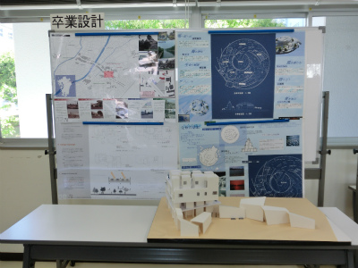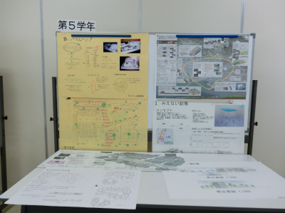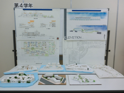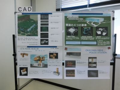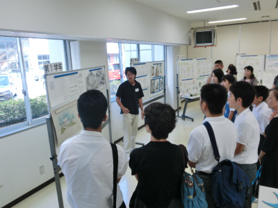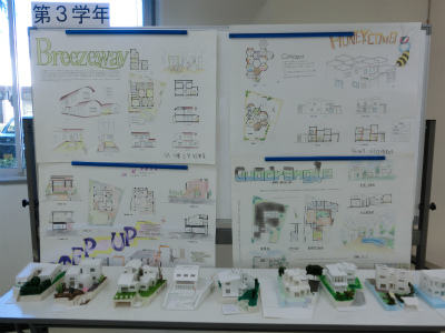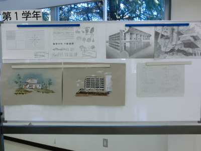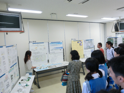 説明は,建築学科5年生が担当してくれました。各学年で取り組んできた課題について,図面や模型を展示しながら解説を行いました。本校建築学科では主に,1年次には線の引き方や道具の使い方を学び,2年次では図面のトレース(模写)や表現技法の修得をします。3年次でオリジナルの住宅を,4年次ではより規模が大きい小学校を設計します。5年次では劇場の設計やコンペの応募,CG製作,卒業設計に取り組みます。学年を経るごとにより高度な課題になっていく様子が,よくわかっていただけたと思います。