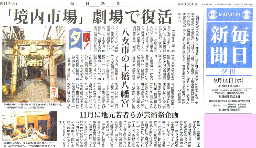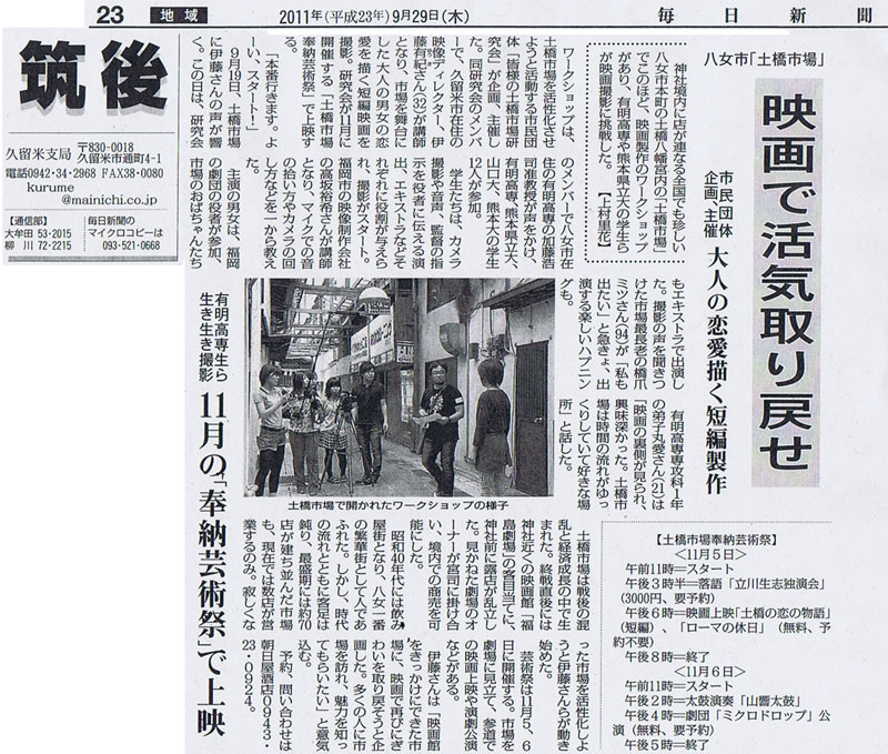 11月5日(土)と6日(日)の2日間,かつては八女地方を代表する賑わい拠点であった土橋市場において,その活性化を図るために「土橋市場奉納芸術祭」が開催されます。19日に撮影したショートフィルムは,その一企画として上映されるものです。