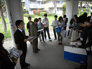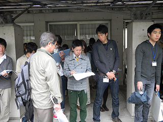 | 建物の説明を聞く学生 | 発見をメモする学生 |