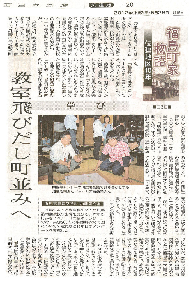 加藤先生が有明高専に着任されて10年. 八女市福島地区のまちづくりや町並みに関する研究を地域に根差して続けてこられました. その取り組みの一部が西日本新聞で取り上げられましたので記事(2012年5月28日付)を紹介します.報道に関わられた皆様,ありがとうございました.