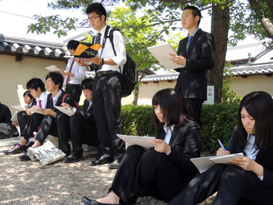 | 法隆寺での見学の様子 | 法隆寺でスケッチをする学生 |