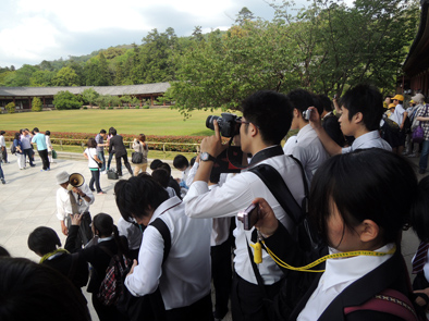 | 東大寺大仏殿を目の当たりにして一斉に写真撮影をする学生 | 東大寺大仏殿での見学の様子 |